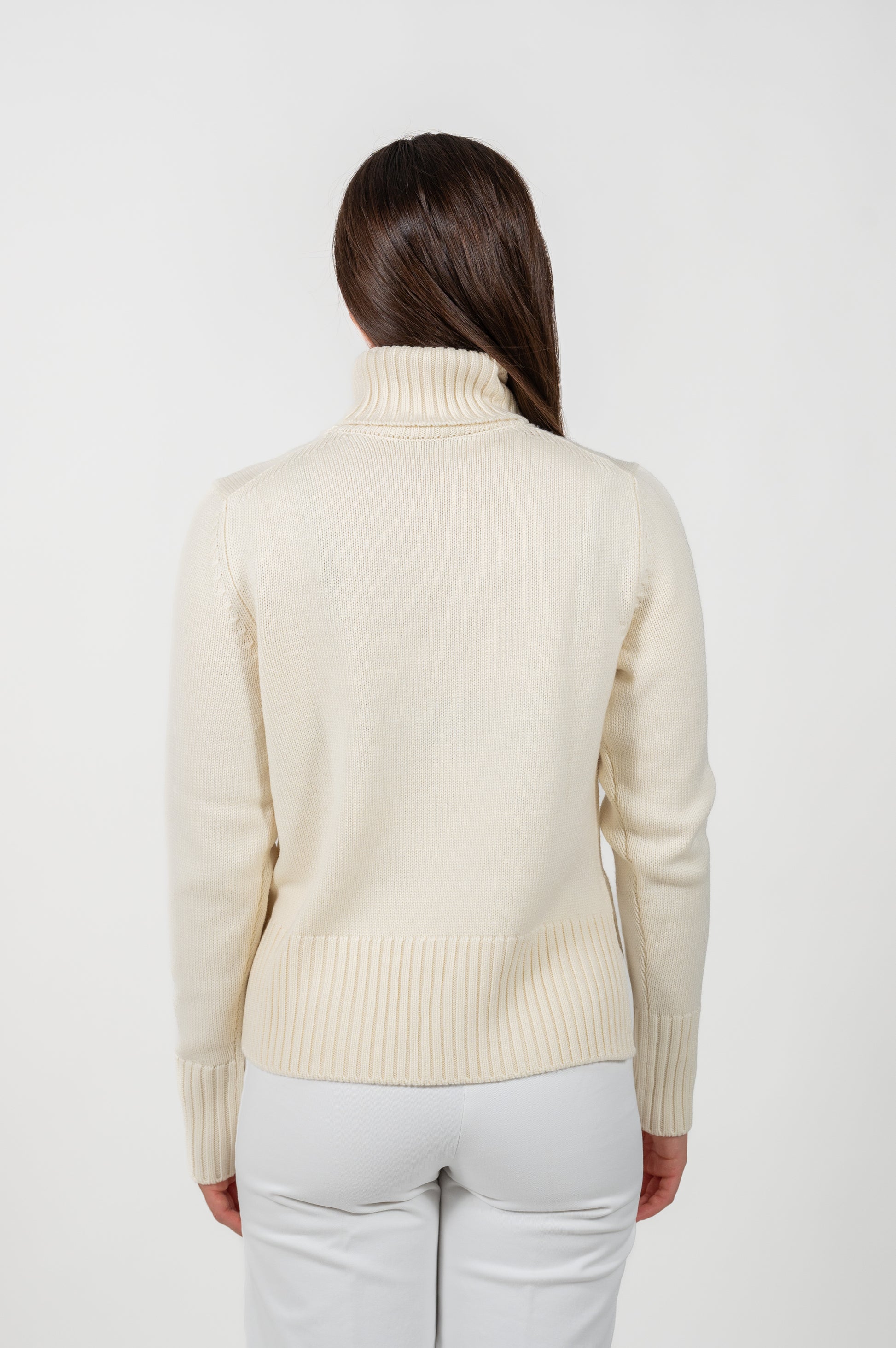 Maglia dolcevita realizzata in Italia, 100% lana merino extrafine con finezza 7. Il capo presenta bordi a coste alte e un elegante spacco sul lato destro, per un dettaglio raffinato e distintivo.