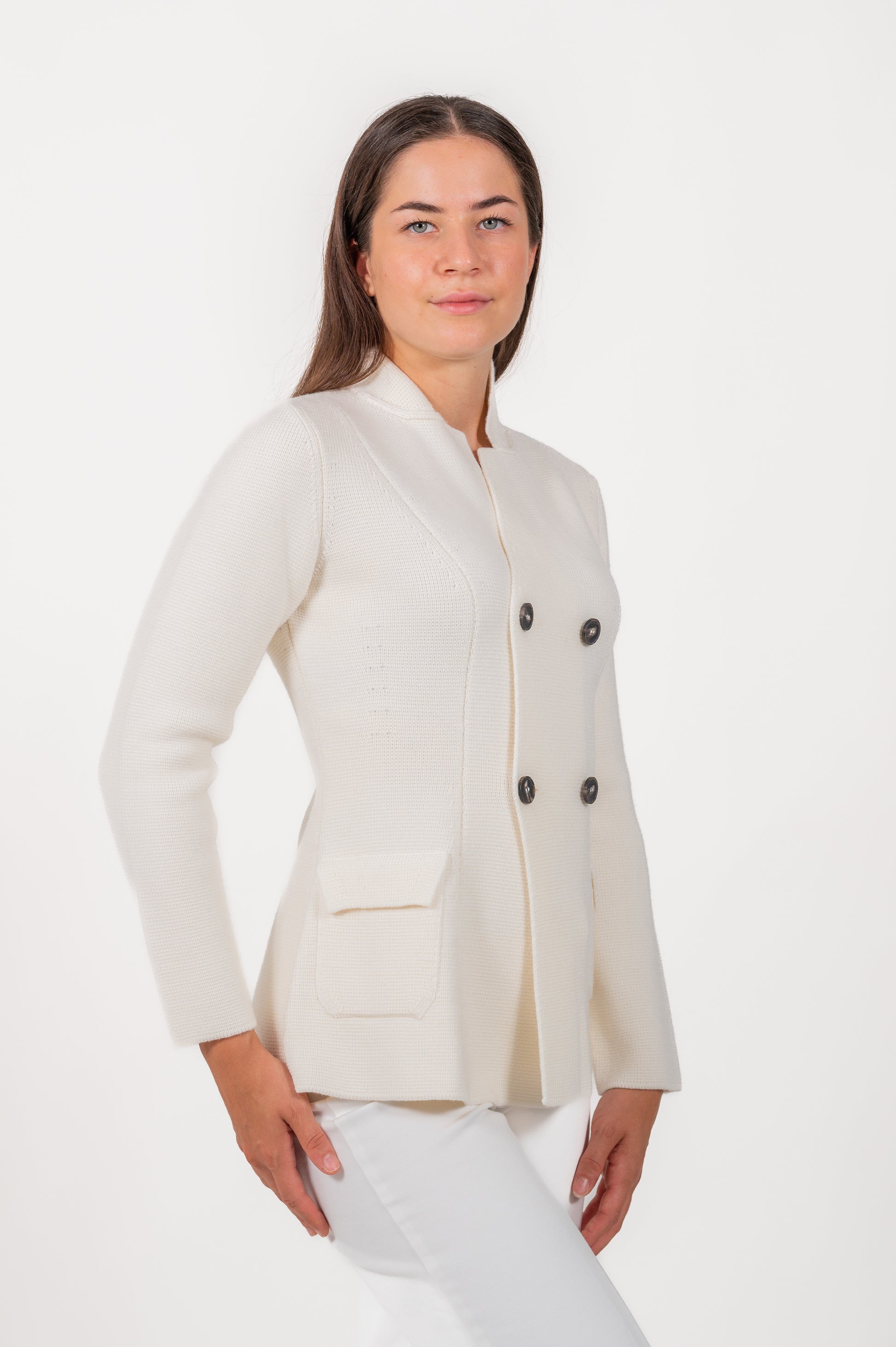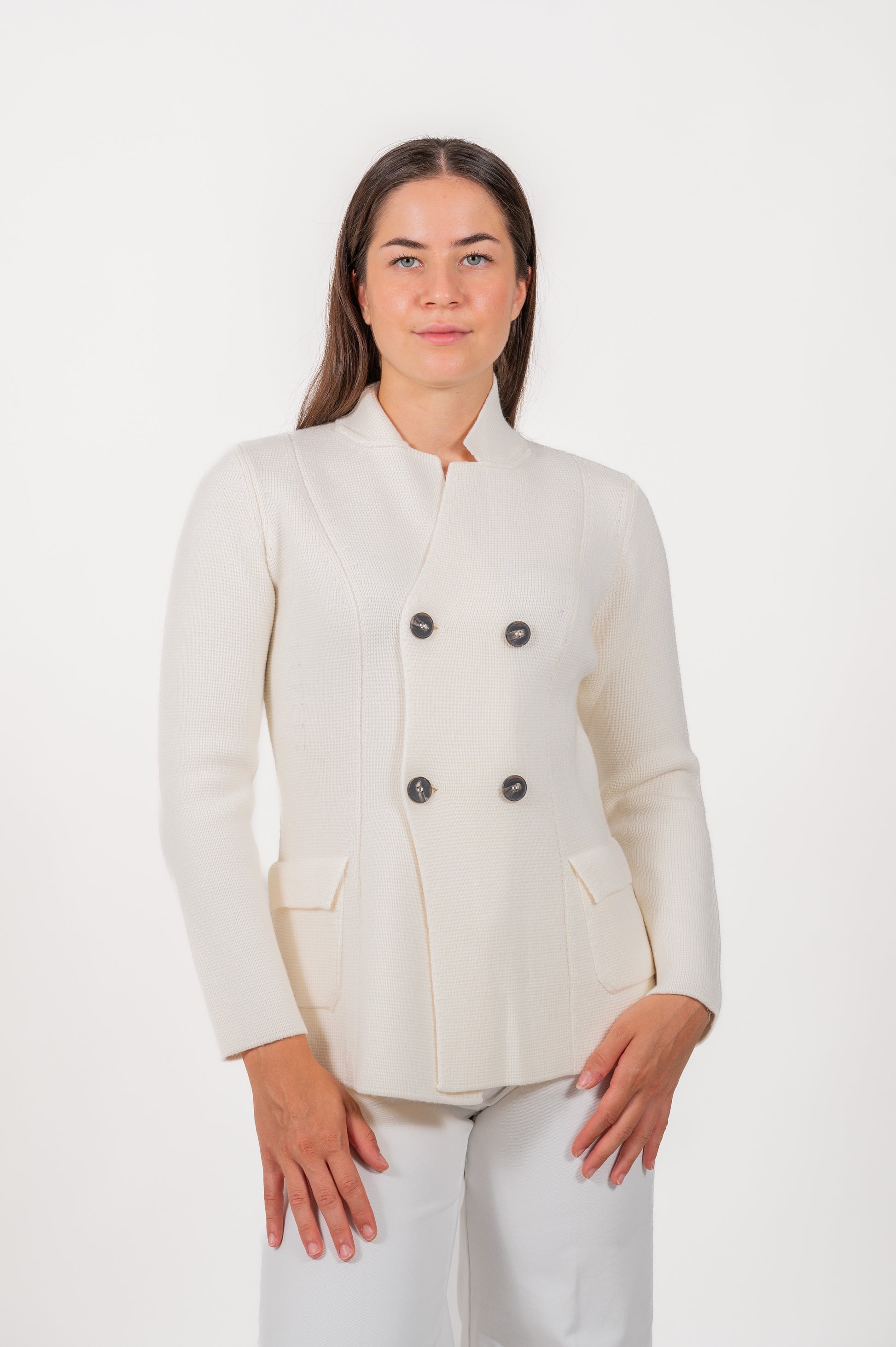 Giacca in pura lana merino con trama a punto stoffa, caratterizzata da una chiusura a doppio petto, realizzata interamente in Italia.