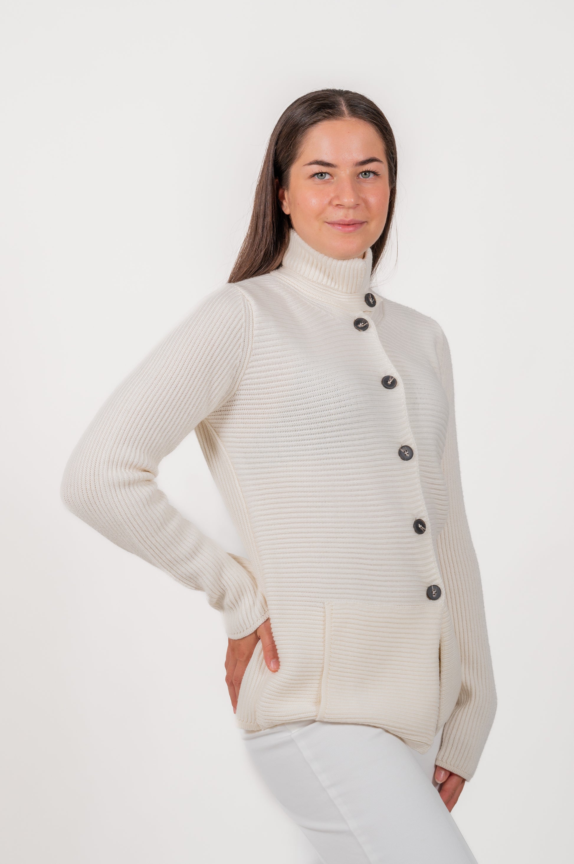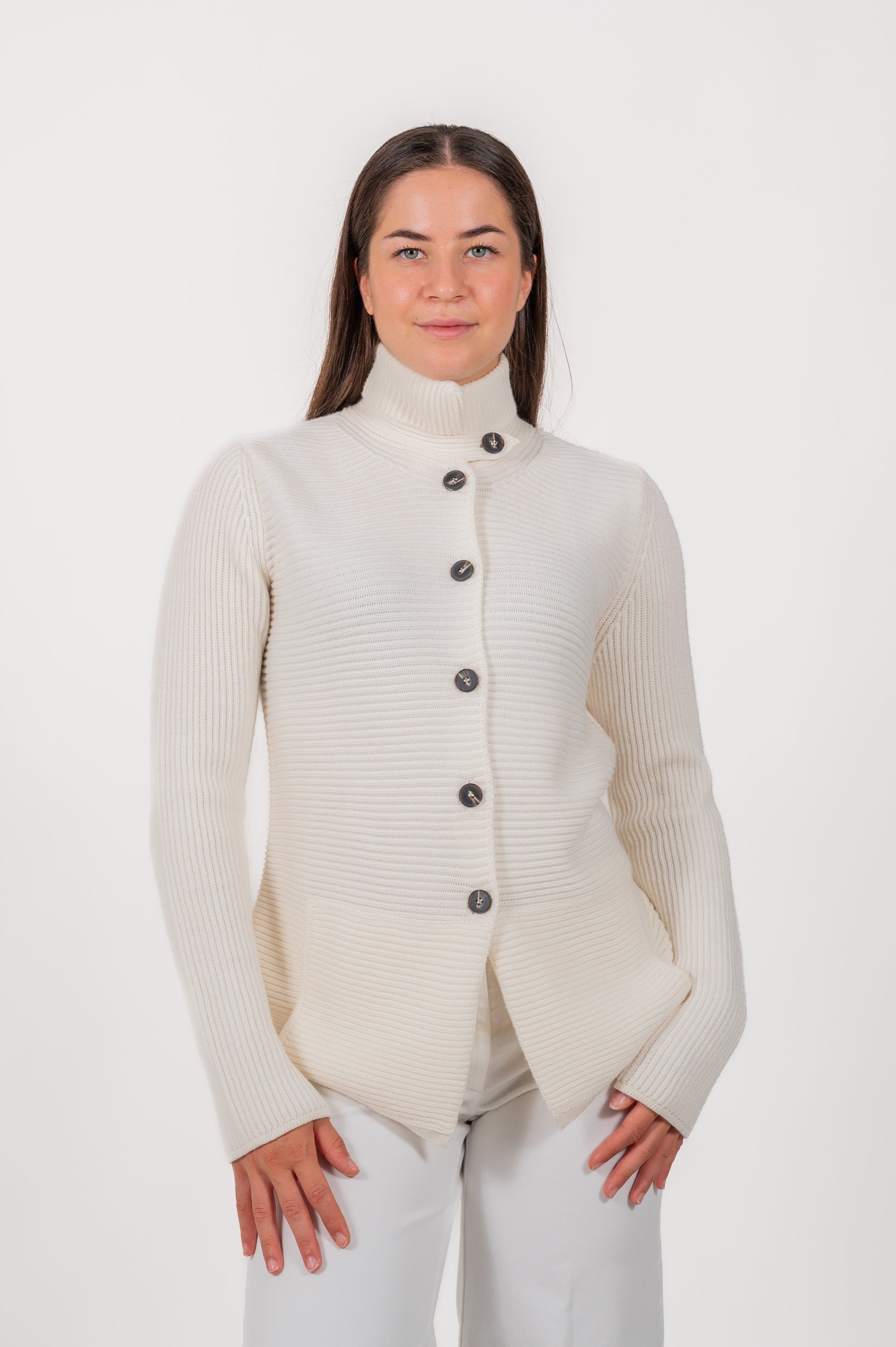 Giacca con collo coreano realizzata in pura lana merino, interamente prodotta in Italia.