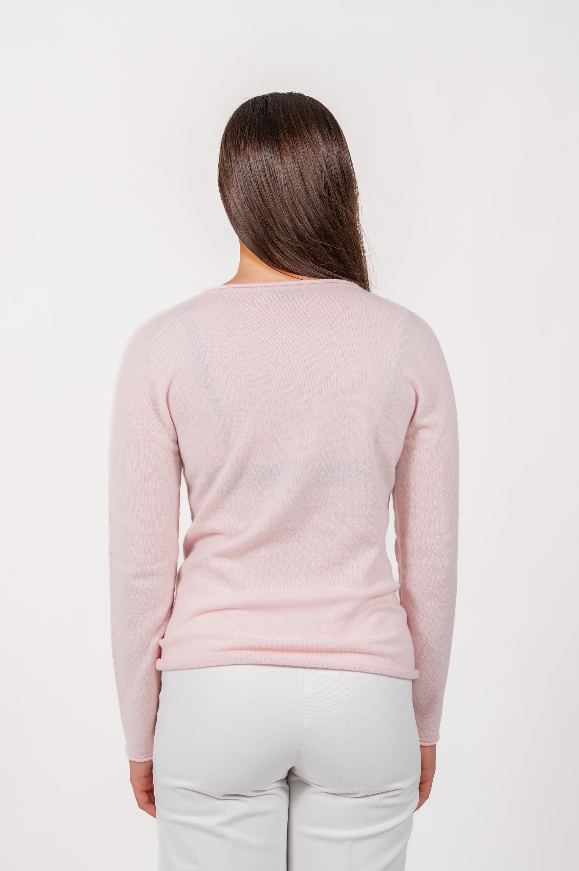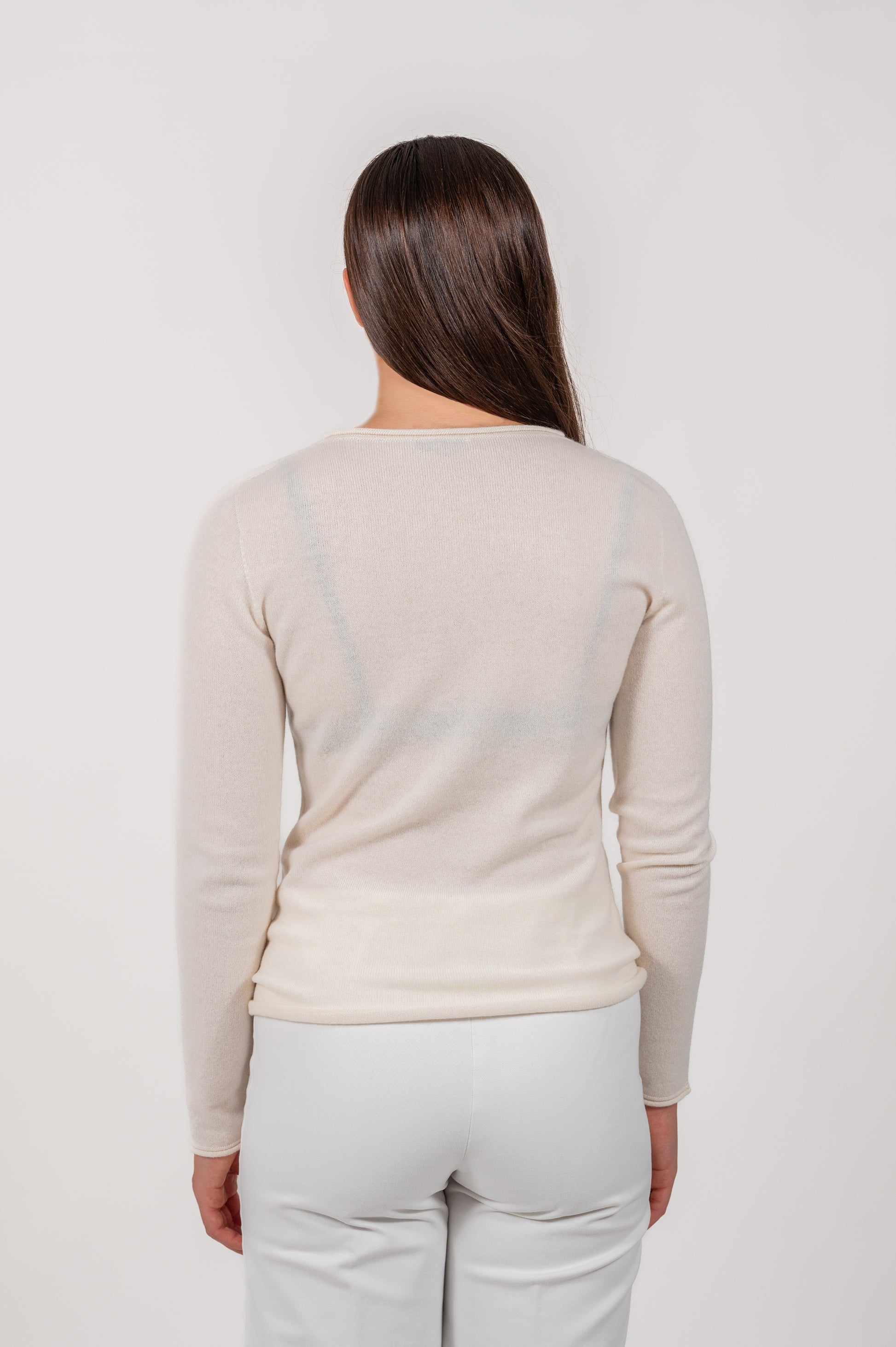 Maglia girocollo aderente realizzata in 100% cashmere, con finitura di pregio a finezza 12 e produzione italiana di alta qualità.