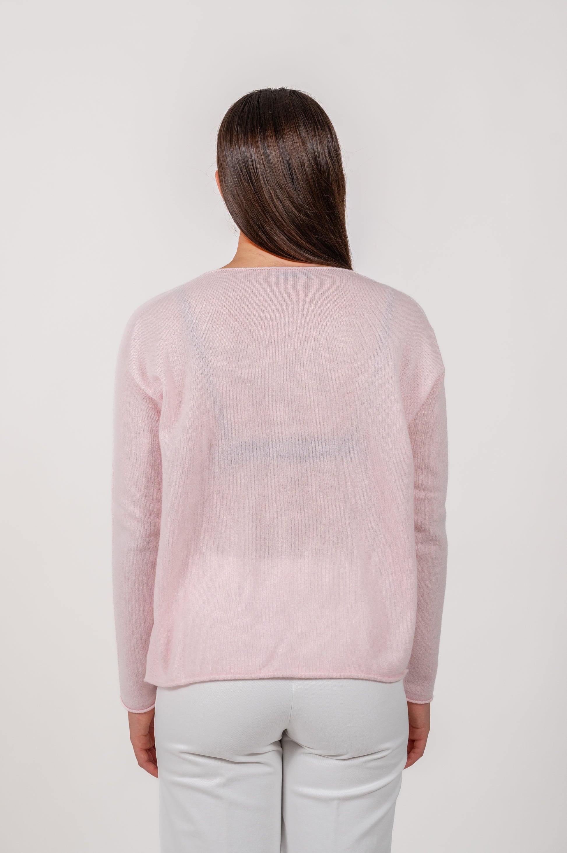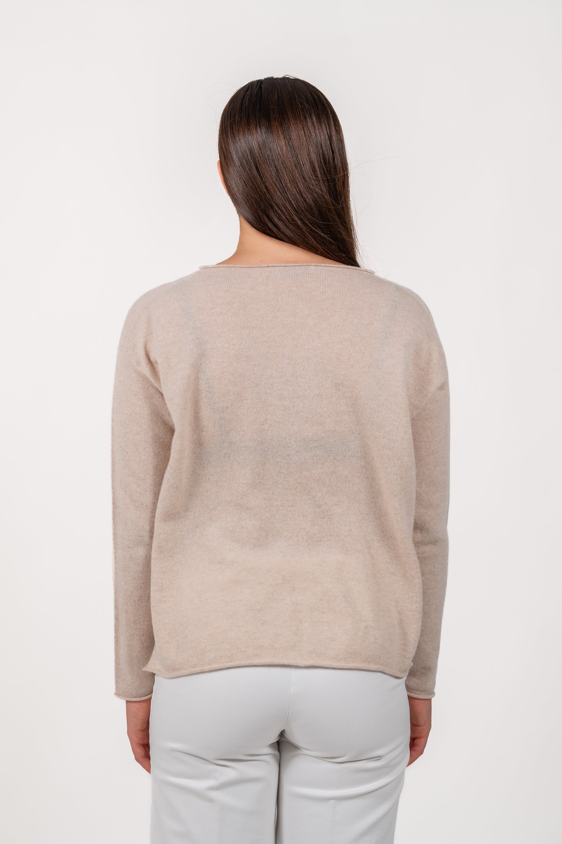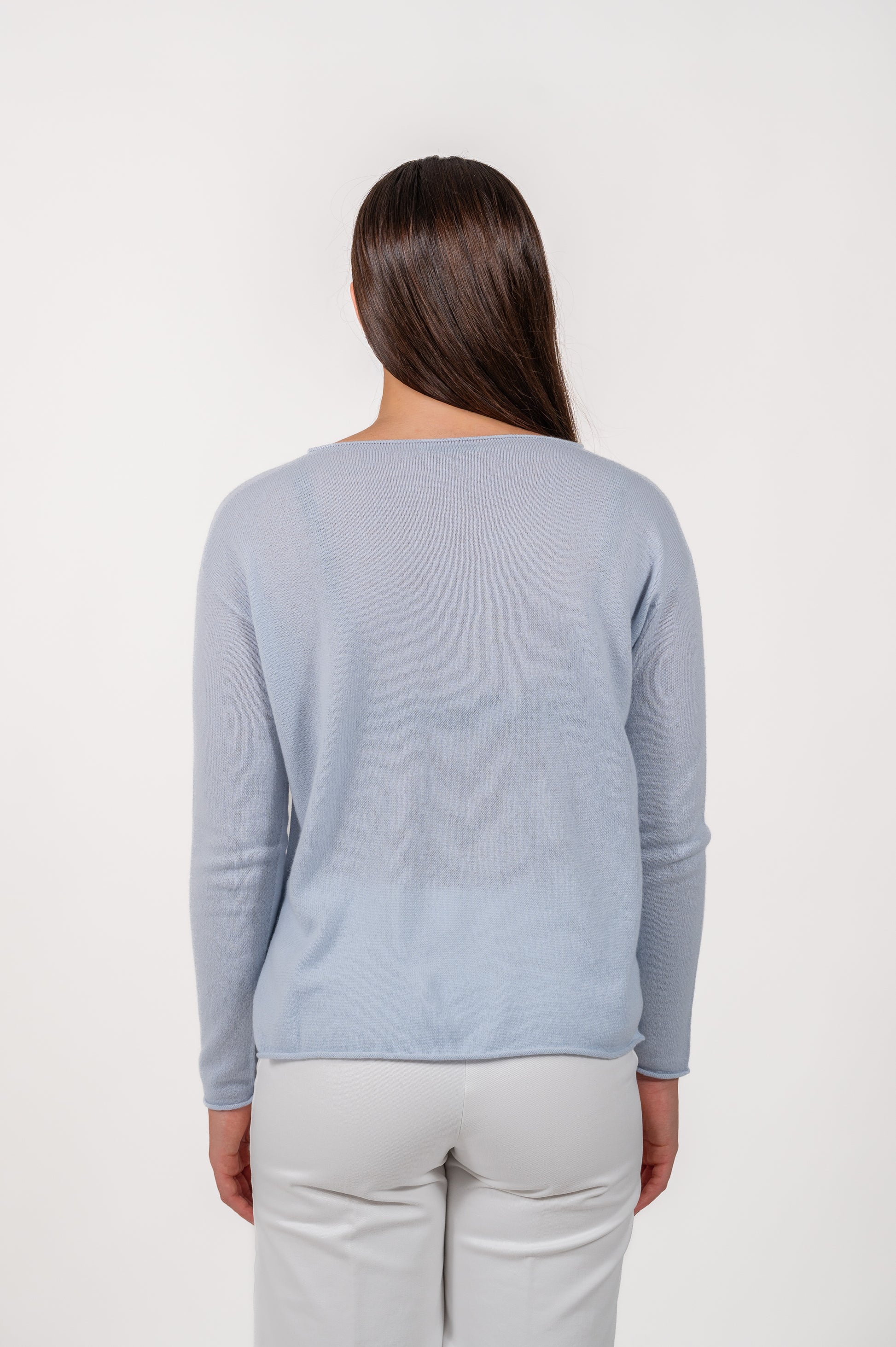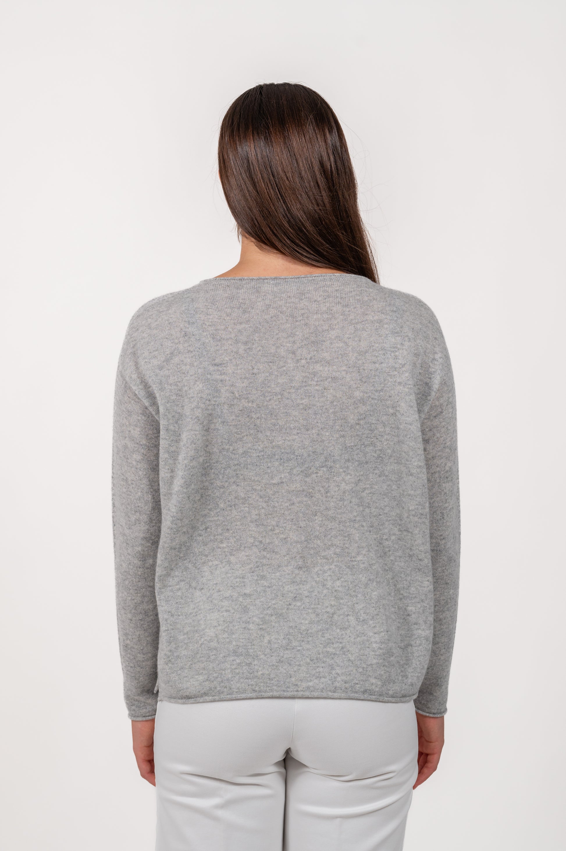 Maglia girocollo dal design elegante con collo a barchetta, realizzata interamente in Italia in 100% cashmere. Presenta una raffinata lavorazione a maglia rasata con finezza 12 e un taglio a scatoletta per una silhouette moderna e sofisticata.